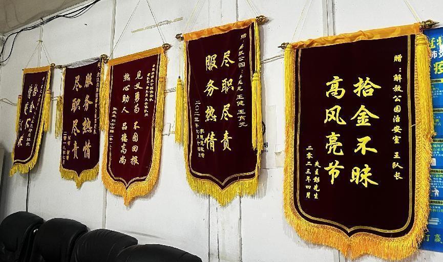 在解放公园的一间办公室中,近十几面锦旗交叠挂在墙壁上,表扬信也是一封又一封,它们几乎成为了房间的“新壁纸”,熠熠生辉。