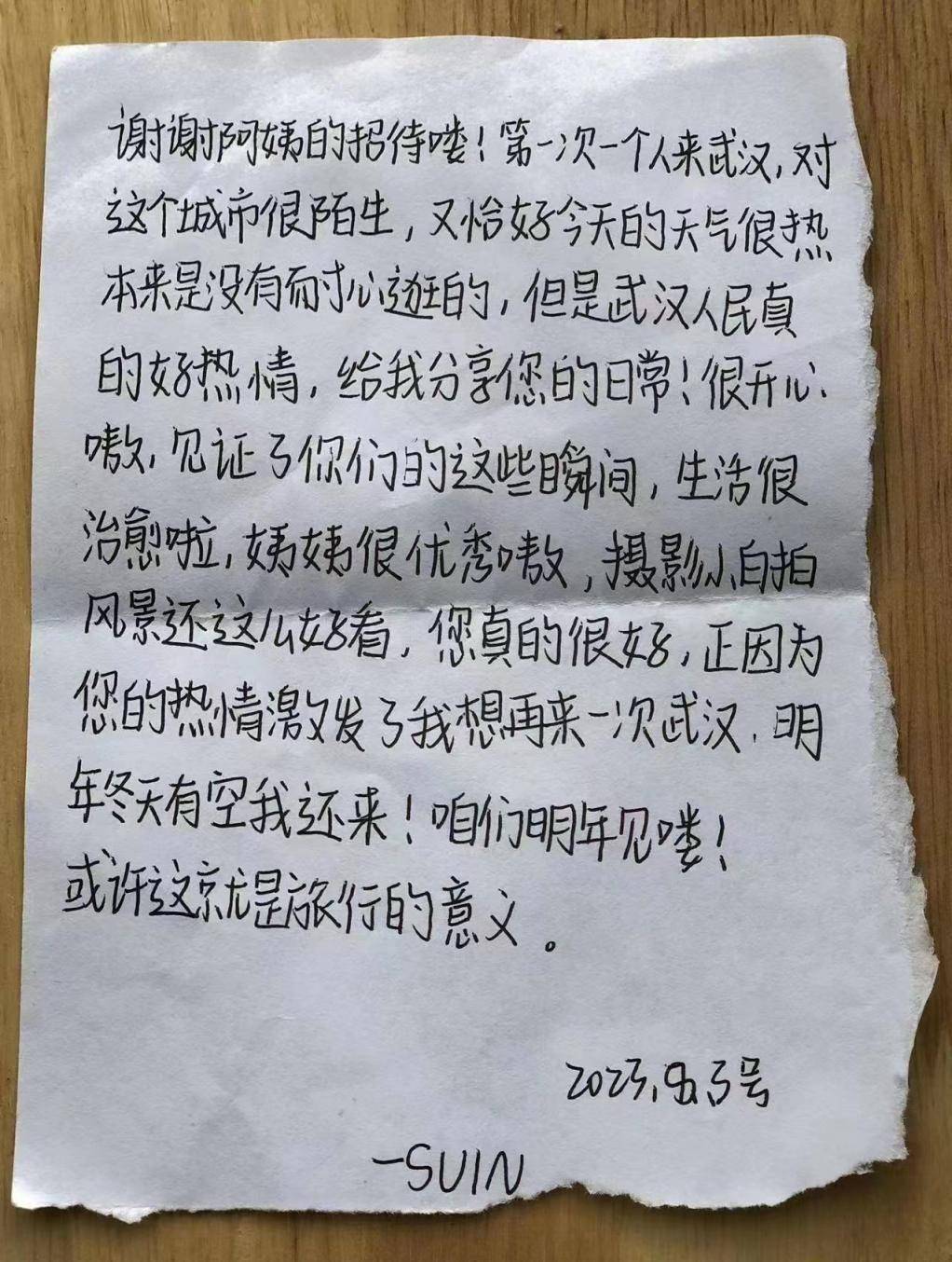 与朱红英的短暂交流,让这位游客感受到了武汉人的热情和友好。在字条中她写到,要约定在冬天再次相聚。
