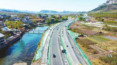 4月7日,在省道103旅游公路项目门牙景区附近,原来的双向两车道已经拓宽至双向四车道,沥青路面已铺设完毕。新扩建的道路利用原来道路的北侧区域建设,沿着河道一路向东延伸至柳埠,道路南侧就是锦阳川河道。