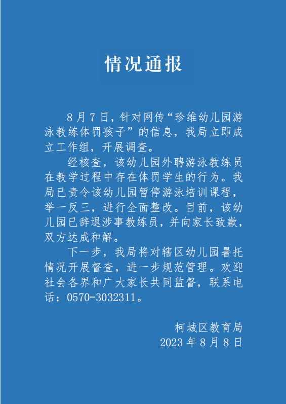 “8月7日,针对网传珍维幼儿园游泳教练体罚孩子的信息,我局立即成立工作组开展调查。