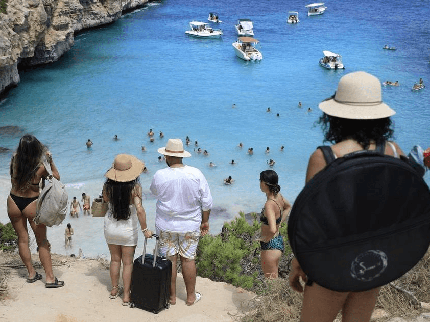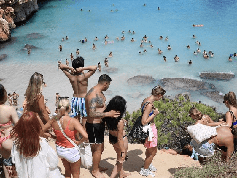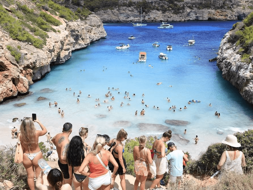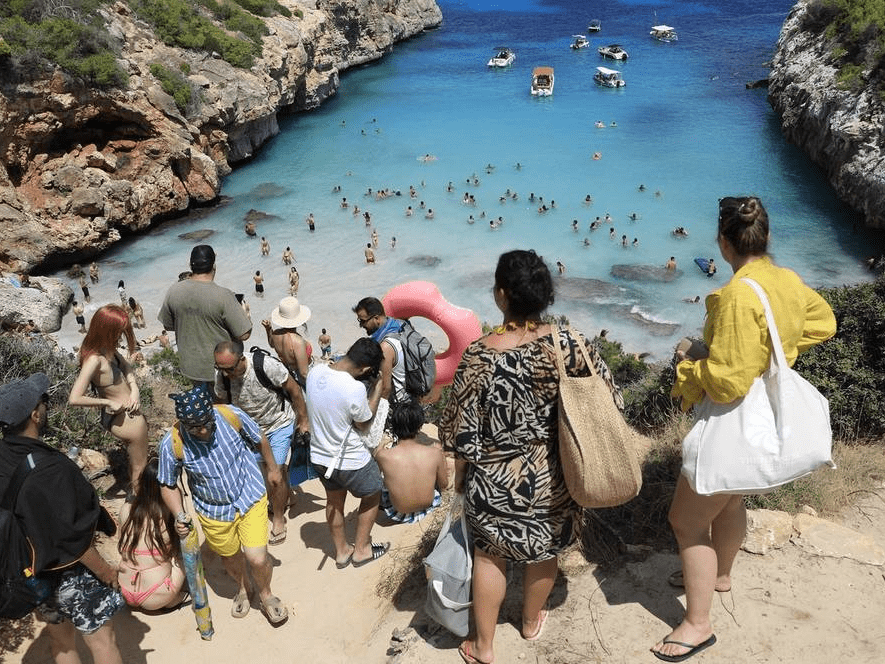 西班牙Santanyi,民众来到马略卡岛的Calo des Moro海滩,这是该岛最拥挤的海滩之一。