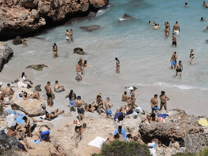 原标题:西班牙马略卡岛海滩游客聚集 涌向海里玩耍