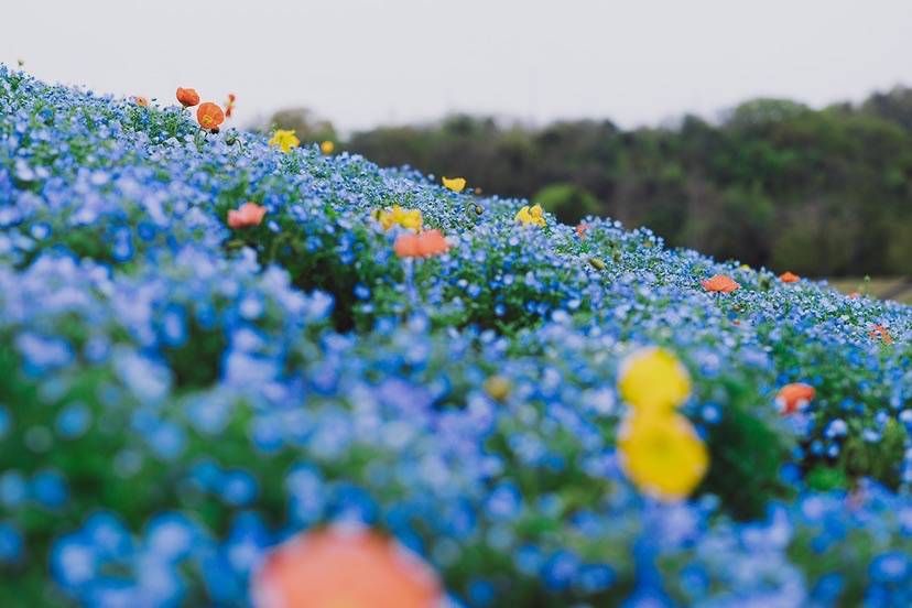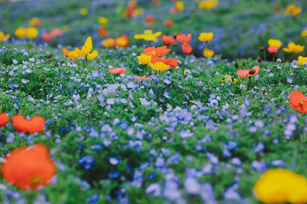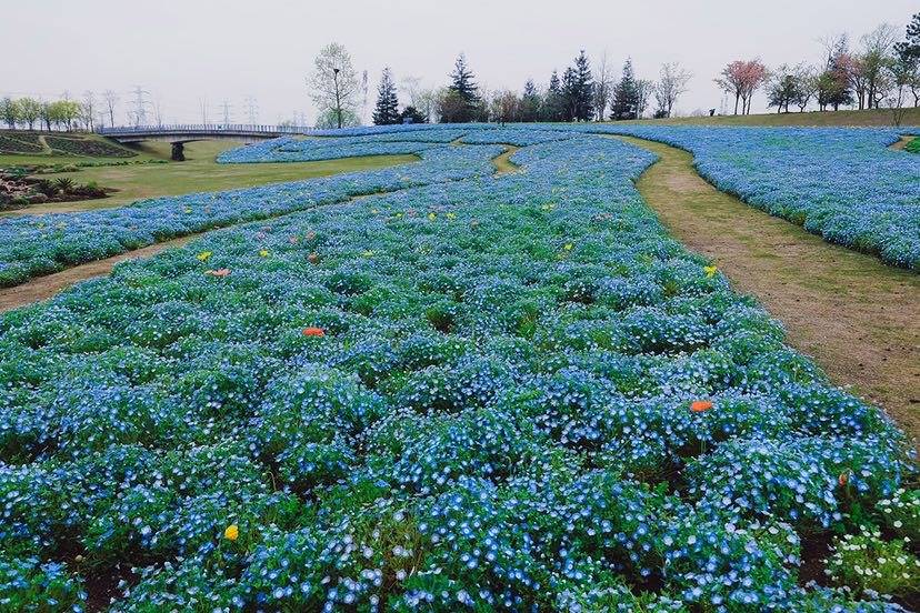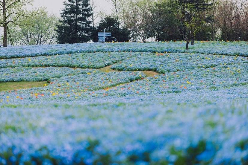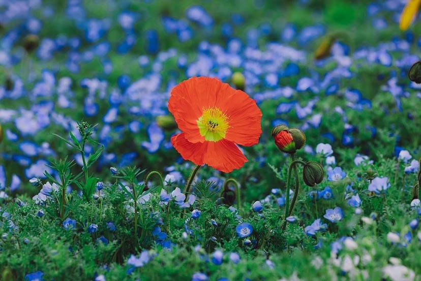 花开时那一片纯净的蓝,其上点缀着黄色、红色及白色的虞美人,像是落入蓝色星海中的红黄宝石,吸引着每一位路过的游人驻足、流连忘返。花海中还配植的粉色福禄考也正值盛花期,一粉一蓝,春日明媚氛围瞬间拉满。
