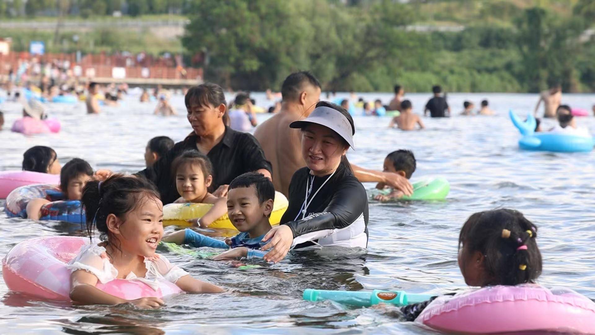 傍晚时分,贵头村鲤鱼坝开启了“下饺子”模式,这里水流平缓,河水清澈,俨然成为了一个天然浴场。家长们带着孩子穿上游泳装备,手拿水枪、游泳圈等各种水上道具,兴奋地在水中跳跃、游泳、打水仗,尽情享受戏水乐趣。