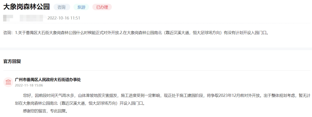 对此,大石街回复表示,因前段时间(「看番禺」注:2022年10月至11月)天气雨水多,山体滑坡地质灾害频发,施工进度受到一定影响,现正处于施工建园阶段,将争取2023年12月前对外开放。另外,出于整体规划考虑,暂无计划在大象岗森林公园南北(靠近汉溪大道,恒大足球场方向)开设入园门口。