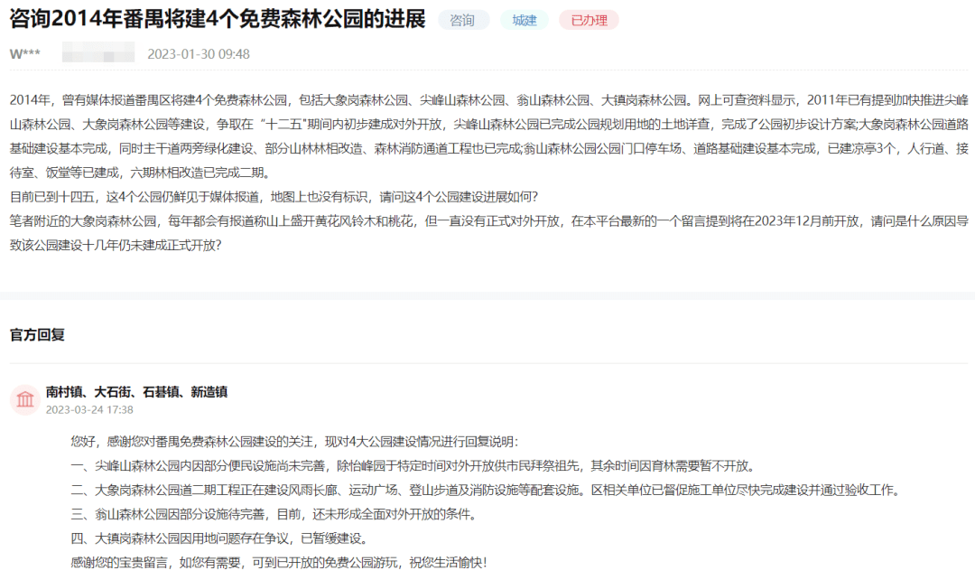 日前,有市民通过问政平台咨询番禺4个免费森林公园的建设进展,番禺官方对此进行了回应。