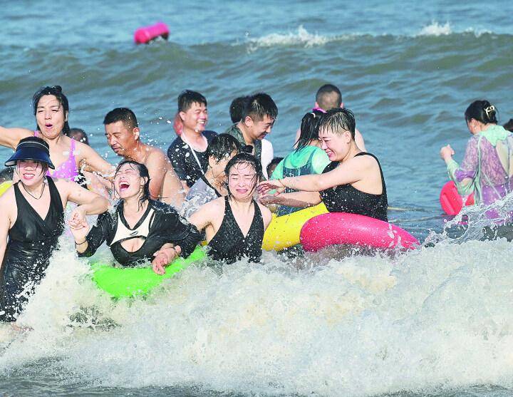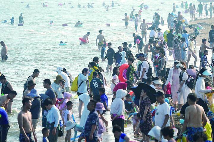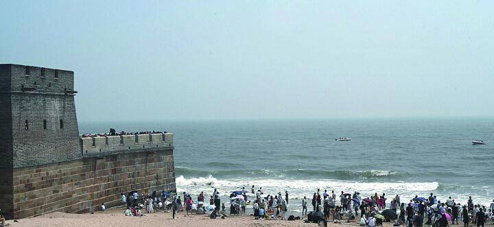 老龙头海滩游人如织。