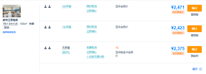 上午11点20分左右,记者查询了杭州亚朵酒店可订的房间,价格最高的也在桐庐。位于富春江畔的桐庐富春江亚朵酒店,2365元起,价格最高的为2417元带有两份早餐的豪华江景套房。从1000元出头的高级大床房,再到1800元左右的几木江景套房以及2100元左右的几木亲子江景套房已经售完。而下周一价格有回落,以豪华江景套房为例回落约600元,价格最低的房型700余元。记者注意到,房源情况一天中也在不断变化,除了套房外,下午四点显示几木江景大床房可订,价格在1400元左右。