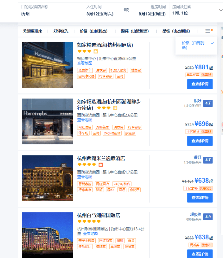 潮新闻记8月8日上午查询的杭州如家周六可订房间的价格(从高到低排序)