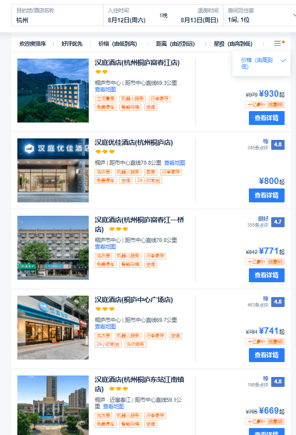 潮新闻记者8月8日上午,对本周六(8月12日)杭州的如家、汉庭、亚朵价格进行了检索。