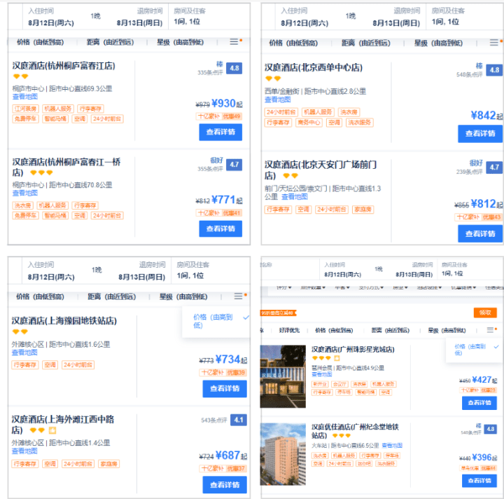 杭州和北上广汉庭本周六可订房间价格,从高到低排序情况