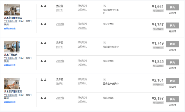 排在第二是桐庐市中心亚朵酒店,价格为1397元起的几木大床房,最高的几木园景套房为1700余元。价格最低的高级大床房破千,已经售完。