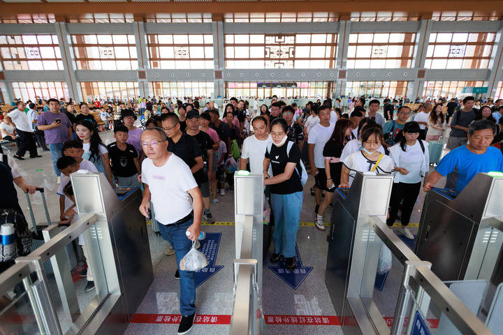 8月8日,旅客在荔波站内检票上车。新华社记者 刘续 摄