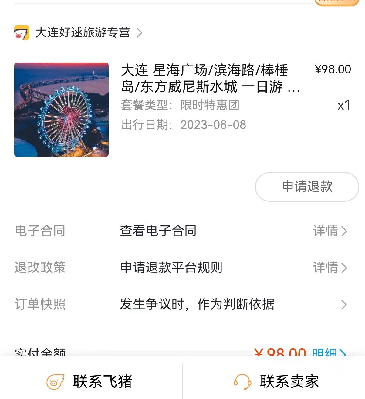 8月7日,从广西来大连旅行的黄女士在网上购买了98元的大连一日游套餐。订单截图显示,该套餐涵盖星海广场、滨海路、棒棰岛、东方威尼斯水城等大连著名景点。出行日期是8月8日。