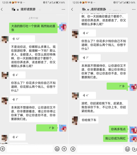 8月8日出游途中,黄女士发现游览的行程和平台上介绍的不一样,于是联系大连好逑旅游的工作人员骆某反馈,被怼“你哪儿那么多事儿,现在是旅游旺季,能理解一下吗”,随后,该工作人员要求其下车,“滚吧,你赶紧给下车”。