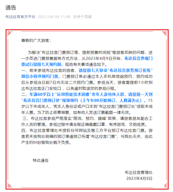4月8日,据布达拉宫官方平台消息,为解决“布达拉宫门票预订难、提前预售时间短”等游客反映的问题,进一步改进门票预售服务方式方法,从2023年4月9日开始,布达拉宫参观门票试行提前七天预约制。现将有关事项通告如下。
