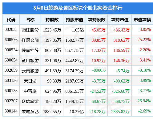 北向资金方面,当日旅游及景区板块北向资金持股市值为14.92亿元,减持0.27亿元。其中增持最多的是丽江股份,增持了486.43万元。减持持最多的是宋城演艺,减持了0.28亿元。旅游及景区板块北向资金持股变动明细见下表: