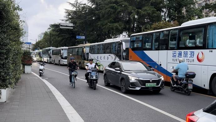 “附近500米左右的位置,就有幼儿园和小学。”唐女士回忆道,自己通常于下午4时左右至学校接孩子放学,早在暑假开始之前,旅游大巴占道停放后引发的安全隐患就已经开始显现,“很多家长载上孩子,都不得不在车流中逆向穿梭,非常危险。”而今年6月以来,由于工作安排,唐女士需每日上午8时驾驶非机动车出门上班,行驶在这一路段的糟糕体验更令她叫苦不迭,“除了像我一样的上班族外,驾驶非机动车途经于此的还有众多外卖员、快递员,行驶速度本就极快,再加上是逆行,真的令人胆战心惊。”