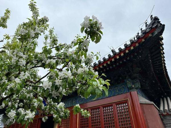 细雨霏霏,智化寺内盛开的海棠花与古建相互映衬。新华社记者杨淑君 摄