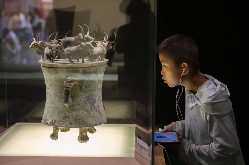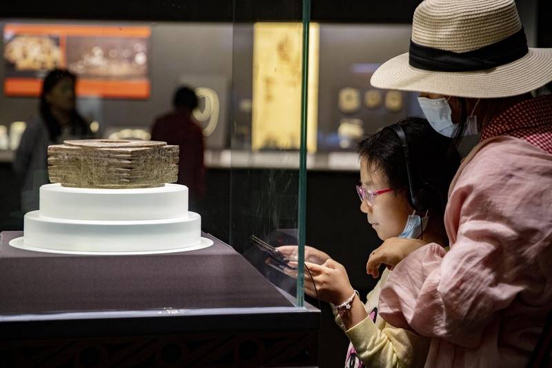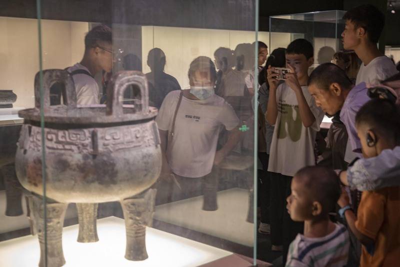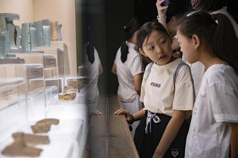来自全国各地的家长带着孩子在博物馆欣赏文物。