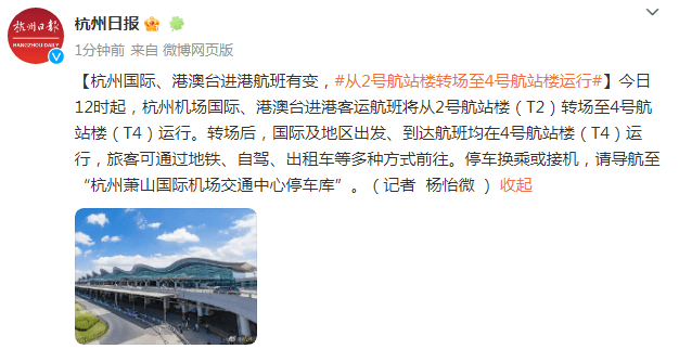 原标题:杭州国际、港澳台进港航班有变,从2号航站楼转场至4号航站楼运行