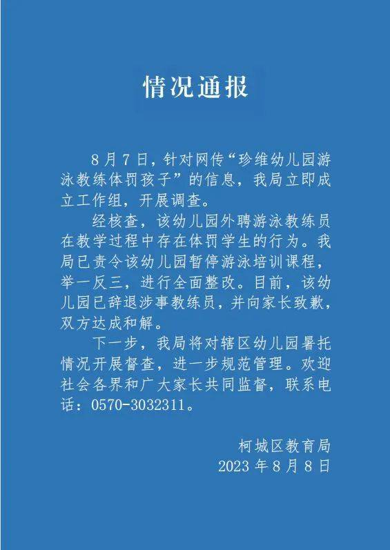 8月8日,浙江衢州柯城区教育局通报“幼儿园游泳教练体罚孩子”事件责令全面整改。全文如下: