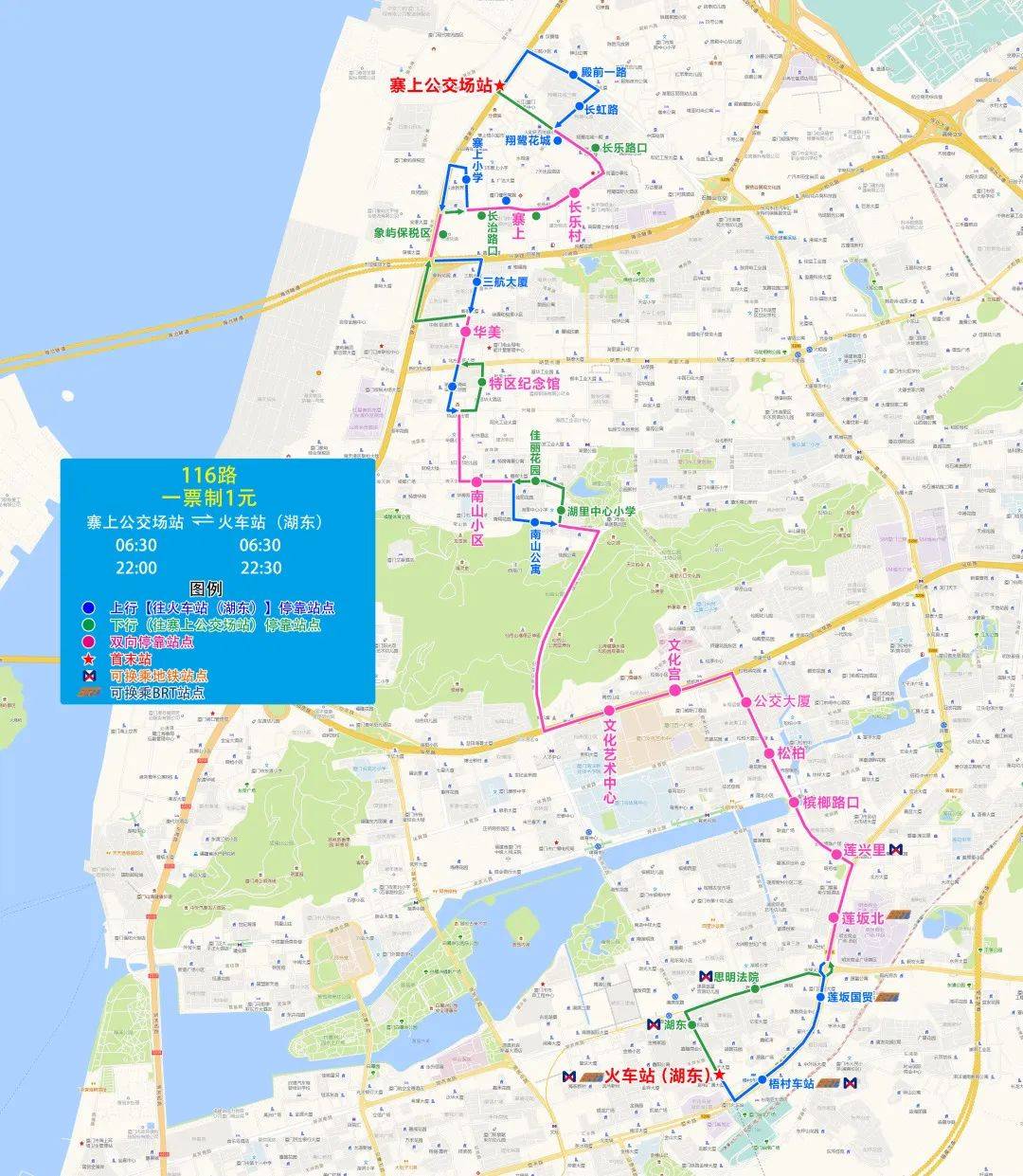 调整116路由厦港公交场站改至火车站(湖东)始发,降低厦禾路、鹭江道的公交线网重复率,提升线路运营效率