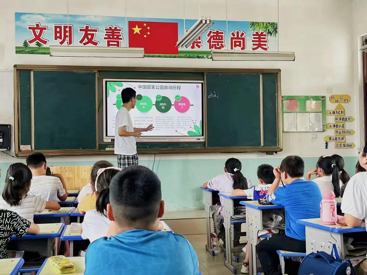 2023年7月22日,为提高社会实践能力,助力乡村教育发展,山东建筑大学“青春同心,共话家乡”依菏队前往山东省菏泽市单县郭村镇中心小学,以“云游国家公园,探索中国宝藏”为主题开展教育活动。国家公园建设和管理水平是可持续发展时代的一面镜子,建设和管理好国家公园不仅是生态环境保护的要求,也是经济和社会发展水平的反映,还是一个国家治理能力、社会文明素养和国民素质的体现。时刻不忘“守初心、担大任“,传承和发扬人与自然和谐共生的精神。通过本次课程讲解,学生了解自然、走进自然,培养学生建立人与自然和谐、共生发展的理念。