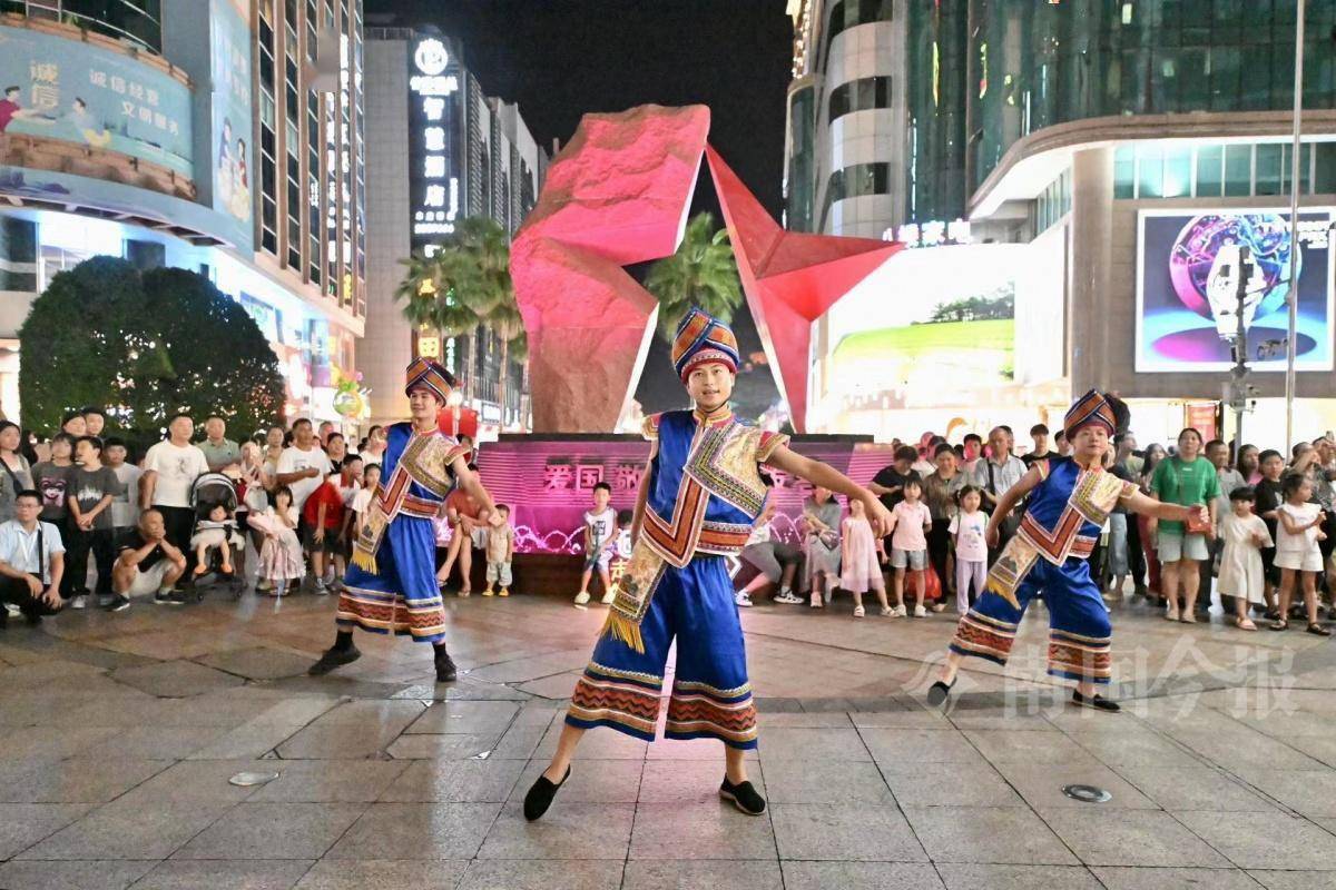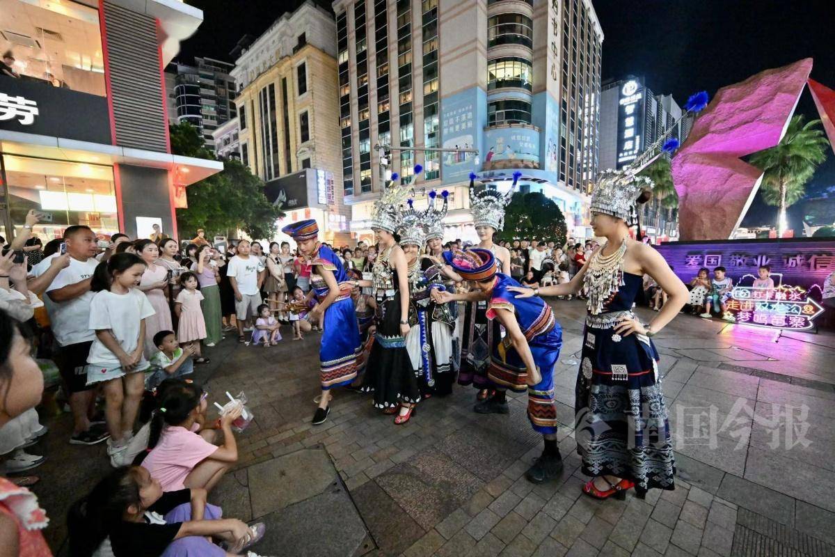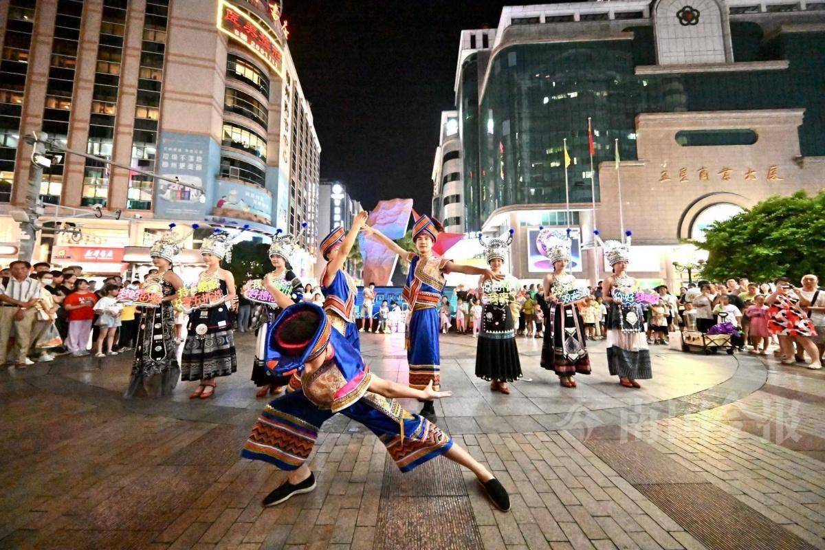 8月9日晚上8时30分,柳州市五星步行街五星雕像前,身着苗族服饰和头饰的阿妹们和阿哥们,载歌载舞,手拿“我在柳州很想你”等字样的灯牌,进行“打卡惊奇柳州·走进梦呜苗寨”快闪活动。精彩苗族风情表演吸引柳州市民和到柳的游客观看。