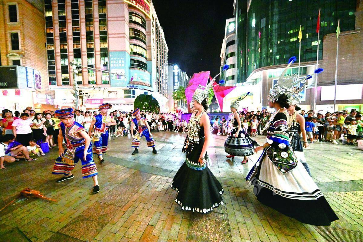 随着暑假来临,柳州文旅热度持续不减,“惊奇柳州”吸引全国各地游客慕名前来。8月9日晚上8时30分,来自广东的胡女士和家人们,在风情港便民夜市吃完柳州特色美食之后,沿着五星步行街散步,行至五星雕像前时,正好遇到“打卡惊奇柳州·走进梦呜苗寨”快闪活动。观看了精彩的表演之后,胡女士他们还觉得不过瘾,现场跟着演员们参与了表演,还借用演员的头饰戴在自己头上,大家一起拍照留恋。胡女士兴奋地说,想不到会在商业街看到少数民族风情表演,自己得到很好的旅游体验。