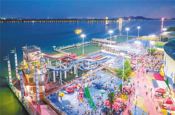 8月5日晚,武汉东湖欢乐水世界,游客在水中戏水纳凉。入夏以来,武汉各大景区推出 “避暑游”“亲水游”“露营游”等多种夜游产品,从璀璨灯光秀到文艺表演,从户外市集到泼水狂欢,多种新型“夜态”大大激发了夏日旅游市场活力。携程数据显示,截至7月23日,湖北暑期夜游景区门票预订量同比增长54%,武汉入选全国十大热门夜游城市。(湖北日报全媒记者 薛婷 摄)
