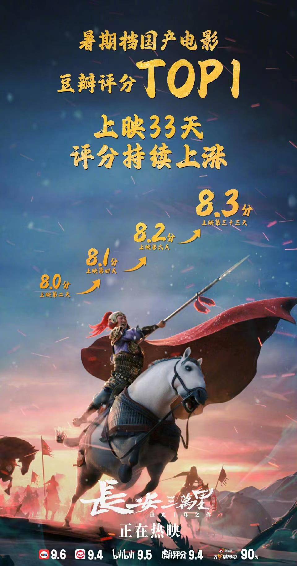 电影《长安三万里》 上映第33天,豆瓣评分上涨至8.3,成为暑期档国产电影最高分。