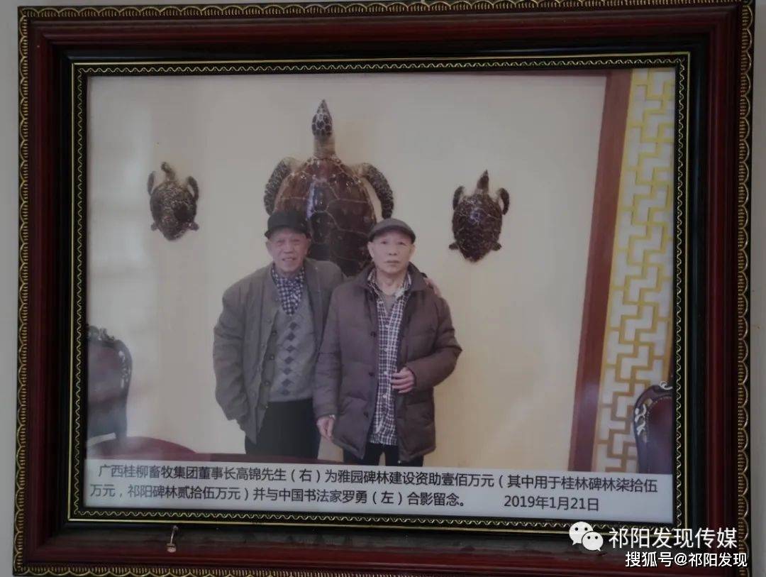 广西桂柳畜牧集团董事长高锦先生(右)为雅园碑林建设资助壹佰万元(其中用于桂林碑林柒拾伍万元,祁阳碑林贰拾伍万元)并与中国书法家罗勇(左)合影留念。 2019年1月21日