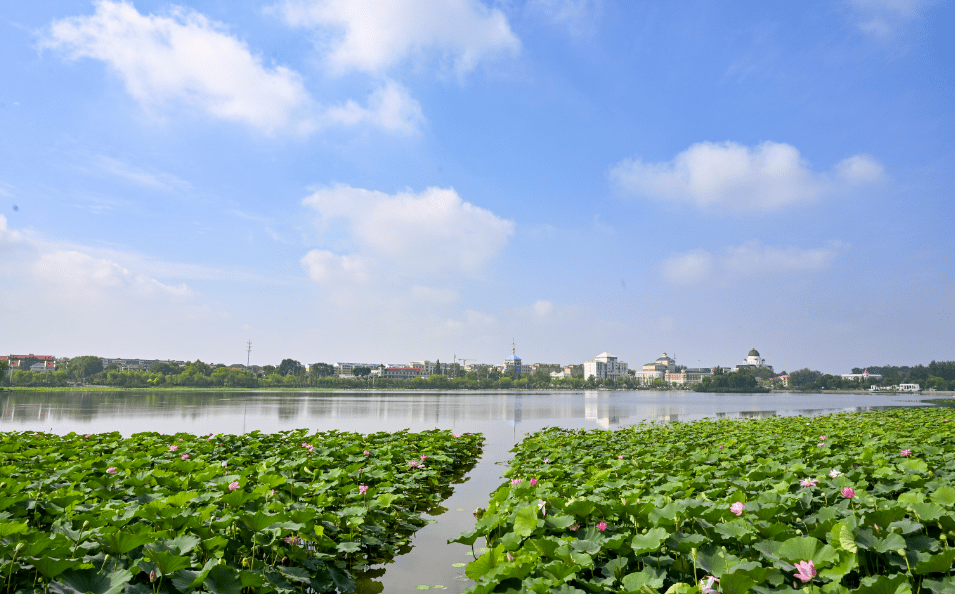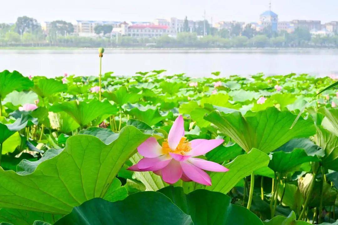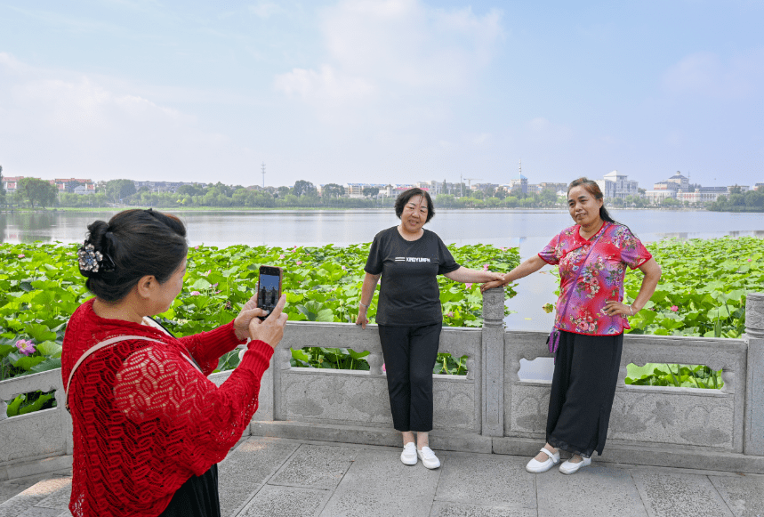 湖面上荷叶田田,绿意盎然。在一缕缕阳光的映照下,盛开的荷花与清澈的湖水交相辉映,构成了一幅美丽的图画。吸引了不少游客近距离赏荷打卡拍照。