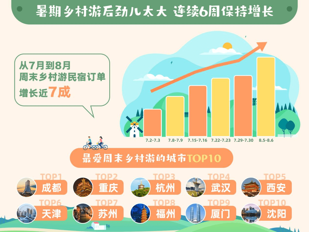 8月10日,记者从携程平台获悉,从进入暑期以来,乡村游民宿订单量已经连续6个周末实现增长,整体增长率超过6成,乡村旅游从暑期一直火到了早秋。而众多新一线城市成为了周末乡村游的主力客源,其中成都、重庆、杭州、武汉、西安、天津、苏州、福州、厦门、沈阳分别是乡村出游热情最高的城市。