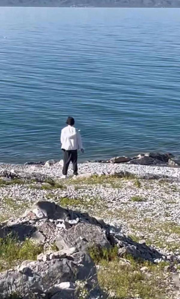 视频画面显示,一名身穿白色冲锋衣,头戴黑色遮阳帽的男子站在青海湖围栏之外,背对岸边,眼前是青海湖清澈湛蓝的湖水,只见他抬高左手作出了疑似小便的动作,画面外隐约听到有人在大喊“回来!”