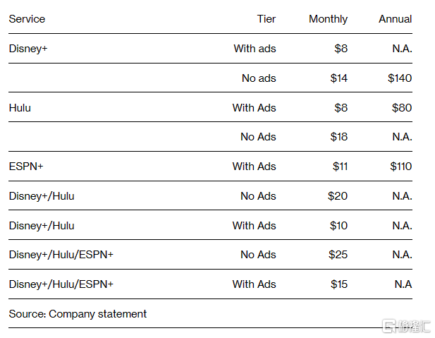 同时,迪斯尼还推出了一个免费的Dinesy+和Hulu的捆绑包,价格为每月20美元。与Disney+、Hulu和ESPN+捆绑的免广告版本将从每月20美元增加到25美元,而带有广告的套餐将从每月13美元增加到15美元。