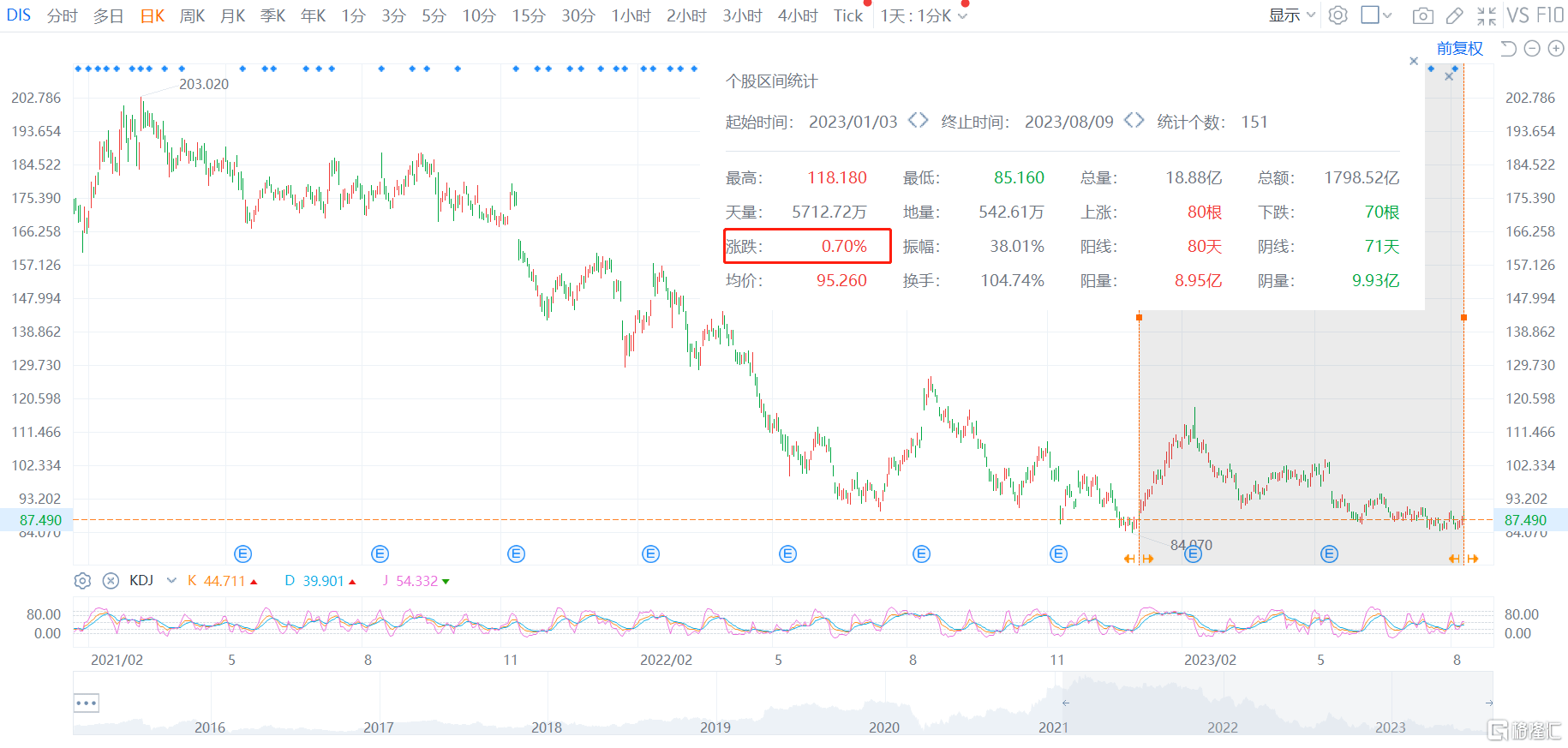 美股盘后,迪士尼股价先跌后涨,涨幅一度超4%,现涨1.9%,报89.15美元/股。今年以来,该股累计上涨0.7%。