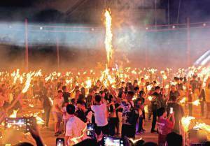 云南民族村,众人点燃火把 ■ 都市时报全媒体记者 庞继光