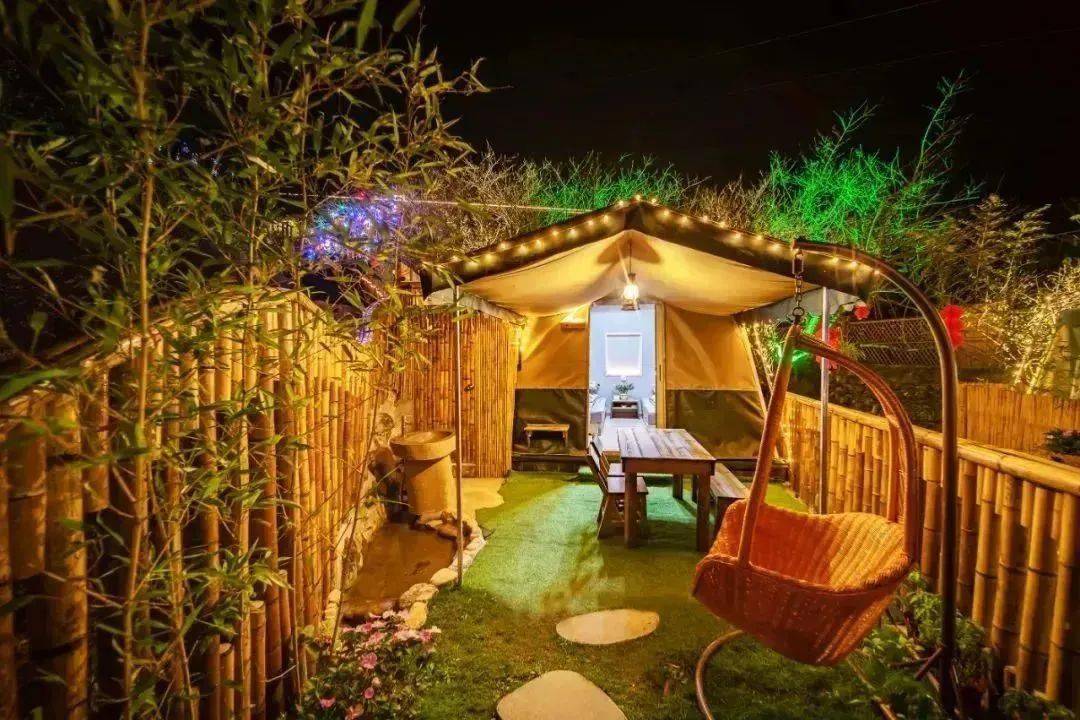 这里的夜晚和白天一样迷人,待天色缓缓落下帷幕,一串串彩灯便从睡梦中苏醒,用暖光照亮了整个营地。