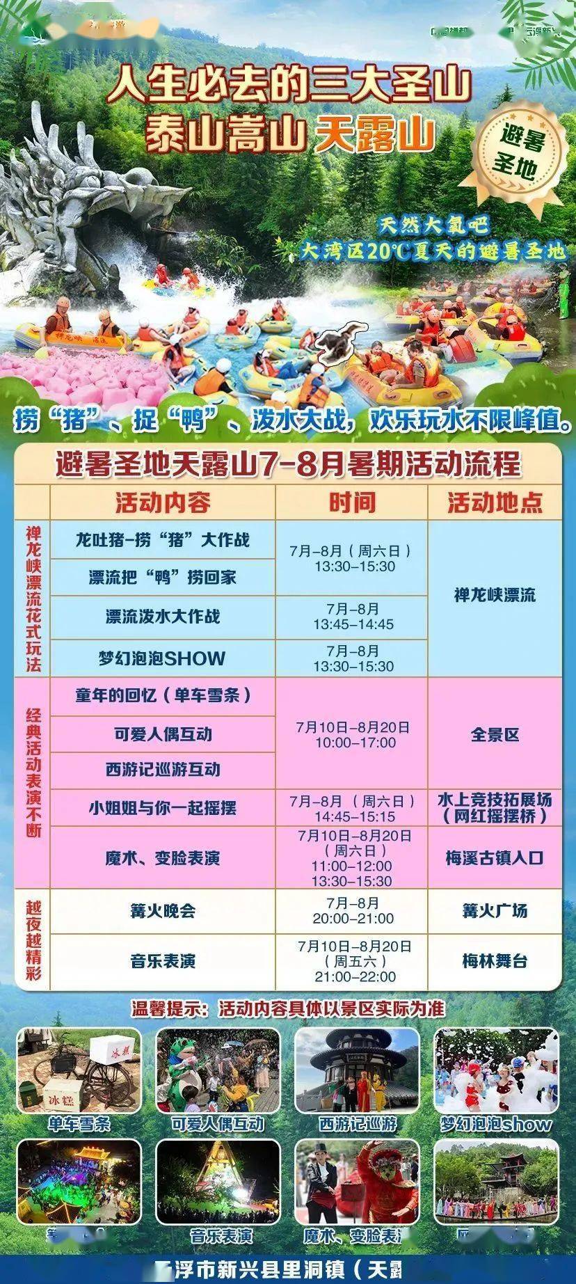 6、免费观看篝火晚会。(晚上8:00-9:00)7、暑假7-8月系列活动:可爱人偶互动、魔术变脸表演、单车雪条、摇摆桥互动、音乐会表演~
