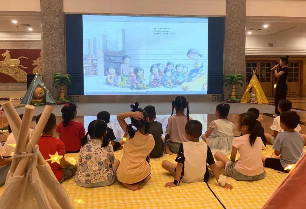 8月7日晚上,参加活动的小朋友们席地而坐,聆听主讲老师分享的绘本故事《图书馆奇妙夜》。故事里,可爱的玩偶们在图书馆度过了奇妙的一夜,还开起了“夜晚故事会”,浪漫有趣的情节让孩子们意犹未尽。