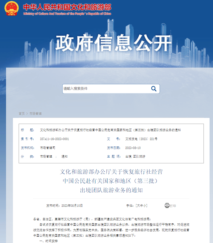 红星新闻网8月10日讯 今日,文化和旅游部办公厅发布关于恢复旅行社经营中国公民赴有关国家和地区(第三批)出境团队旅游业务的通知,全文详见: