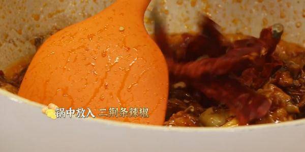 锅中加入油、葱、姜、蒜、八角、花椒、豆瓣儿酱,小火炒香后加入鸡肉、生抽、老抽、蚝油、料酒、二荆条辣椒,大火煮开。