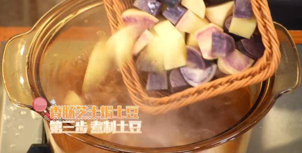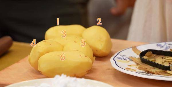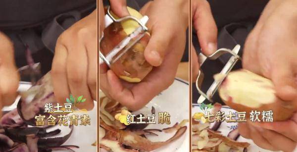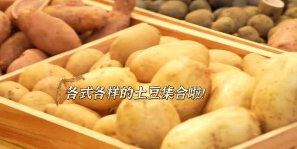 两位做土豆的高手先来教饭团们认识土豆:脆土豆个头大,形状规则,表皮光滑;面土豆颜色深,麻点密集,形状不规则;贵州高山紫土豆富含花青素,淀粉含量极高;青海黑土豆皮薄如纸,肉质水嫩,口感粉糯;大凉山七彩土豆富含矿物质和多酚,比普通土豆更耐储存;珍珠土豆个头小,好入口,带有清甜味道。