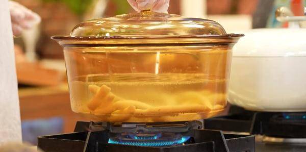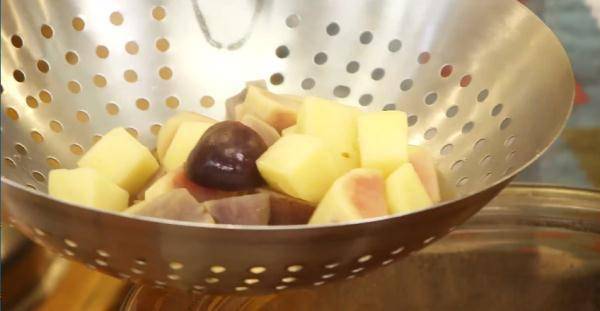 料水中加入土豆,煮制4分钟后捞出沥干水分。