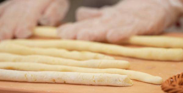 将土豆压成土豆泥,加入土豆淀粉,搅拌均匀,揉成粉团,取适量粉团搓成条状。