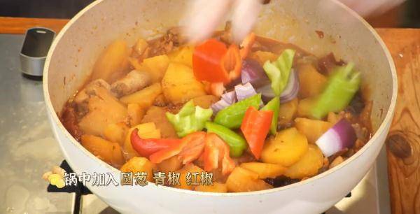 加入土豆,盖上锅盖焖炖15分钟,加入圆葱、青椒、红椒后小火转大火,焖煮2分钟。