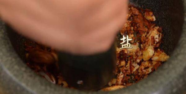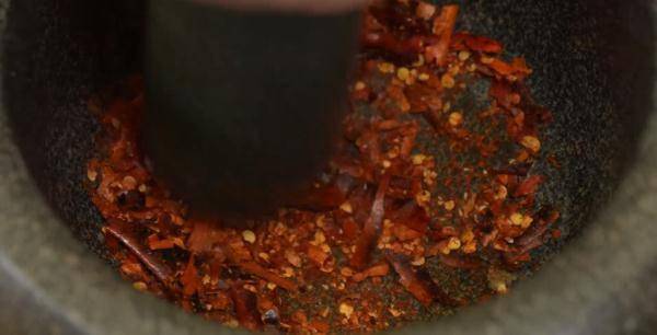 干焙辣椒放入石臼中捣碎,加入蒜、盐捣碎后盛出,加入蛋黄酱、番茄酱、柠檬汁、红酒醋、盐,搅拌均匀。