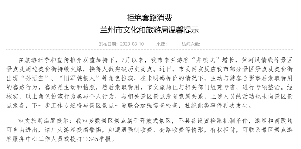 据兰州市文化和旅游局官网消息,8月10日,兰州市文旅局发布旅游消费提示,提醒游客提高警惕,如遭遇强制收费、套路收费等情形,有权拒付,可联系景区景点游客服务中心工作人员或拨打12345举报。